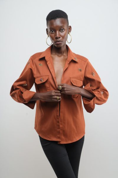 Rust jacket with beaded bugs