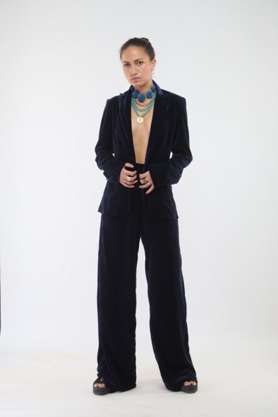 Dark navy blue velvet jacket and dark navy blue velvet wide leg pant