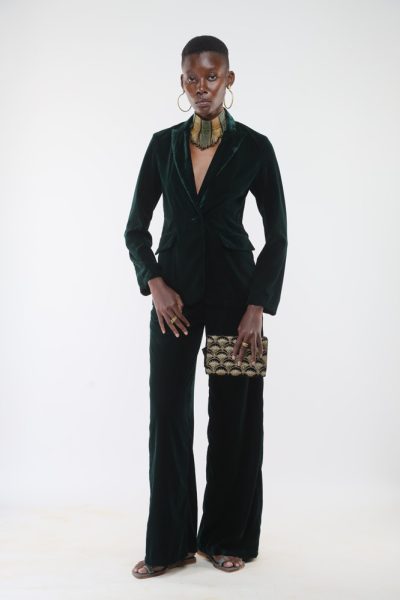 Dark emerald green velvet jacket and dark emerald velvet wide leg pant