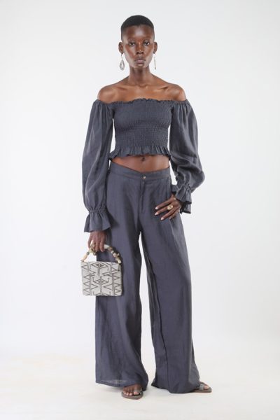 Charcoal grey off shoulder Lamu top and charcoal grey pleated Lamu palazzo pant