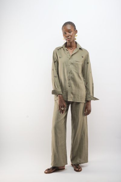 Sage shirt with beaded bugs and sage Shela palazzo pants