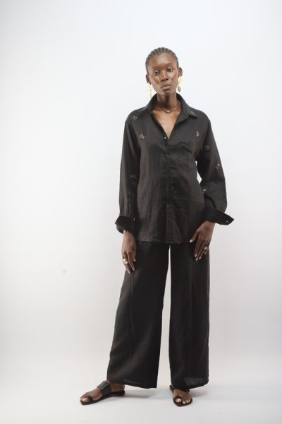 Black shirt with beaded bugs and black Pate wide leg pant