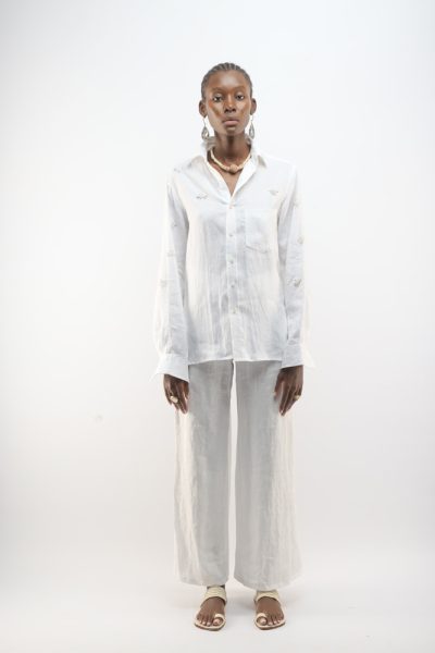 Bright white shirt with beaded bugs and bright white Shela palazzo pants
