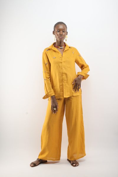 Tumeric shirt with beaded bugs and Tumeric Pate wide leg pant