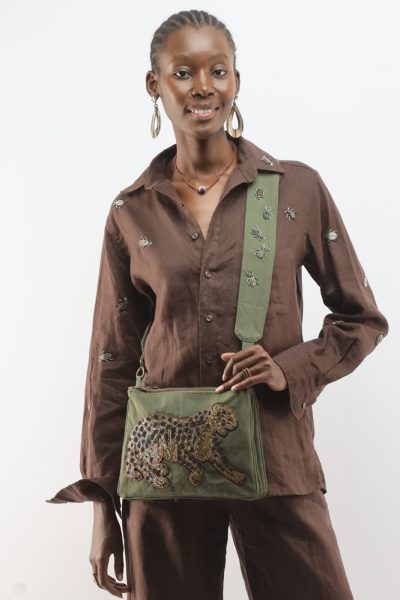 Forest green safari bag with beaded leopard