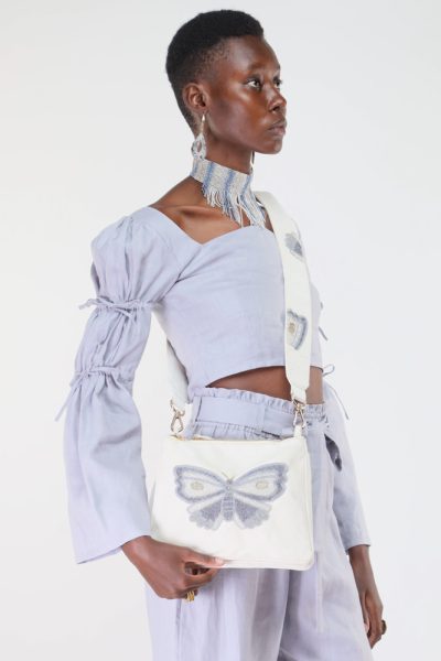 Bright white safari bag with beaded butterfly