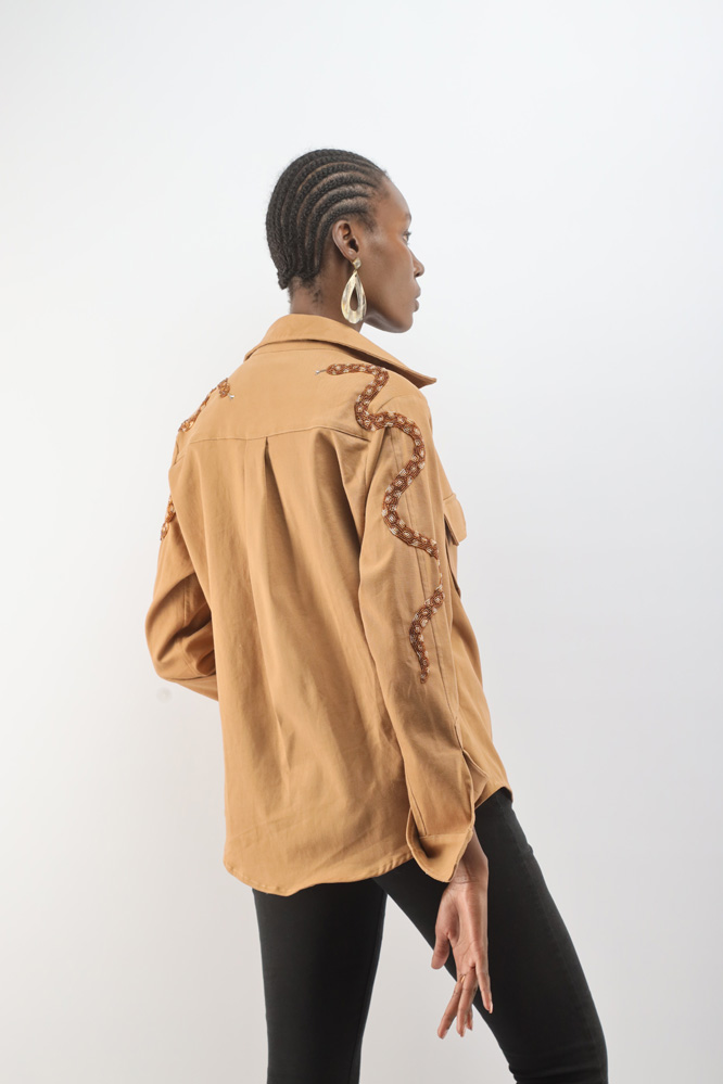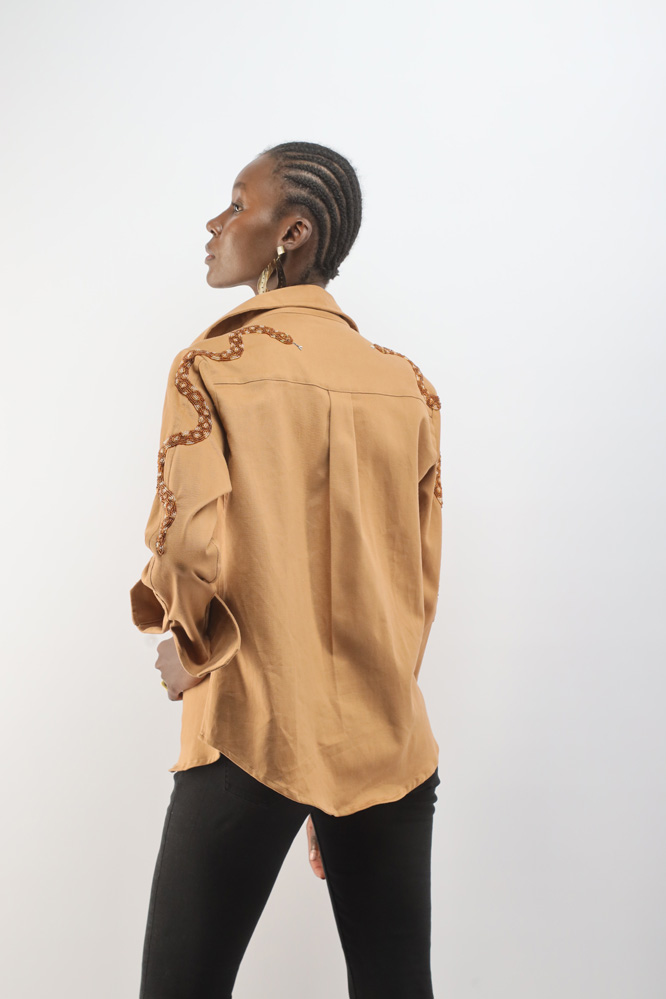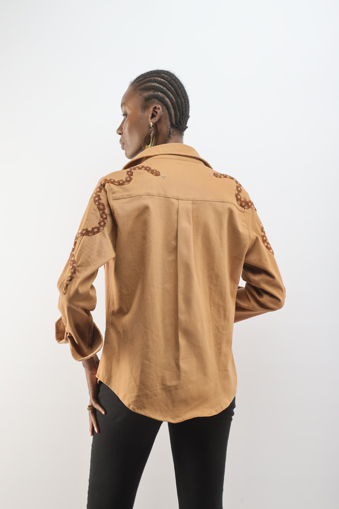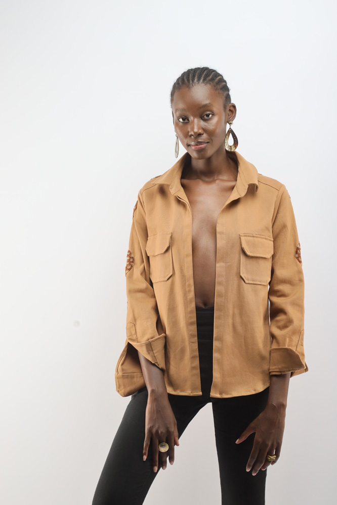 Made from cotton drill and hand beaded by Kenyan women. We support slow fashion by producing small, made-to-order collections to minimize environmental impact. Custom orders are available in any measurement and fabric colour from our stock. Please allow 3 to 4 weeks for stitching and delivery.