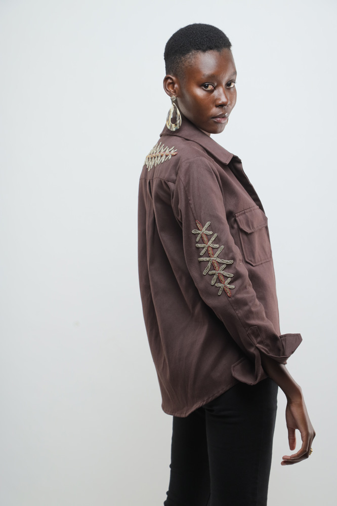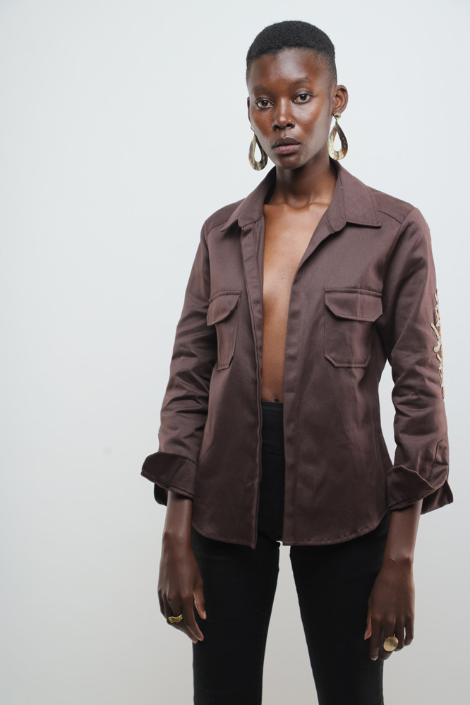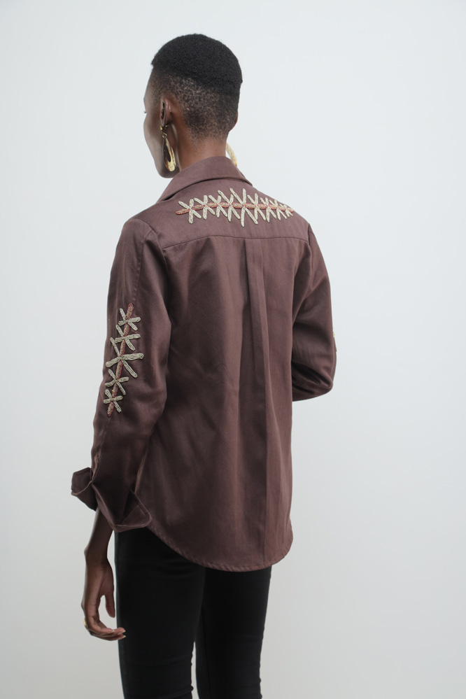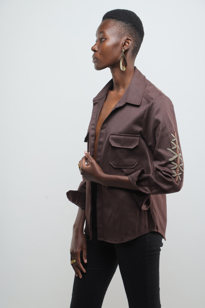 Chocolate brown jacket with beaded kuba flowers